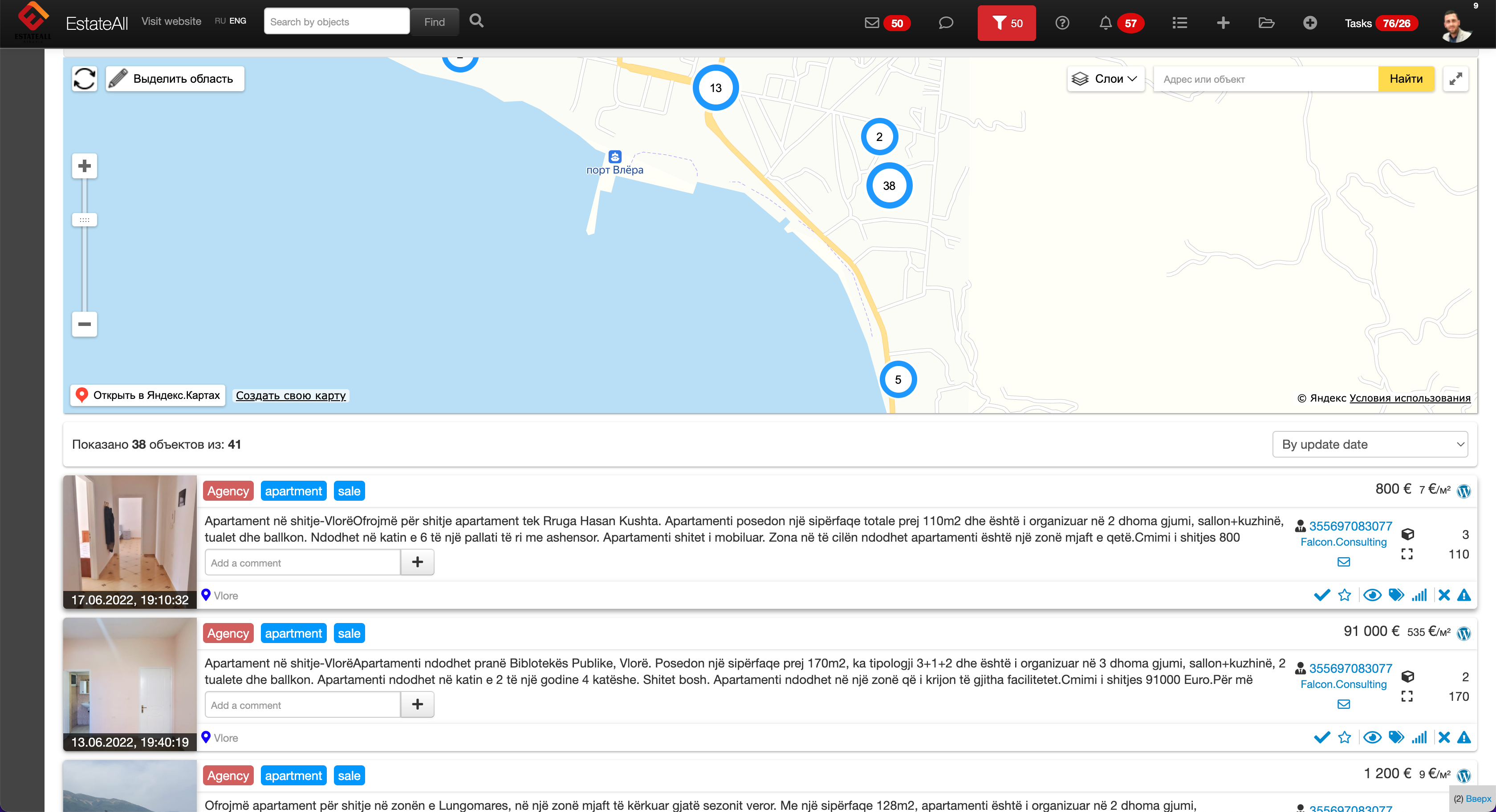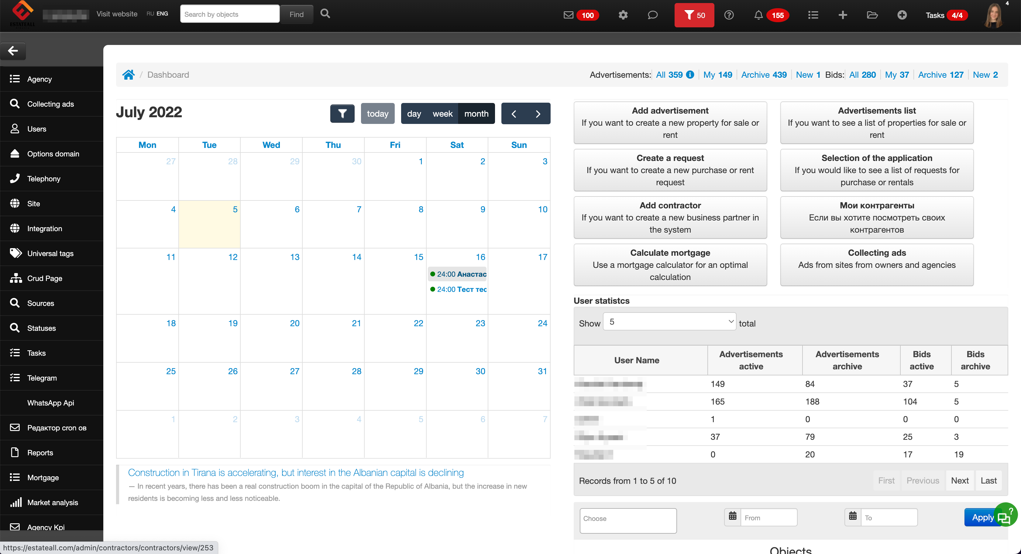 Powerful CRM for real estate business. Combines all the functions which are used in real estate agencies. It is an automated whole business process of a real estate agency. The real estate scraper finds new objects. Integration with telephony allows you to call the owner before other agents and get a contract. Database of real estate objects is connected with classifieds and boards. Objects automatically published on that platforms.